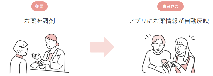 薬局側は通常通りお薬を処方するだけで、患者さまはアプリで処方されたお薬情報を確認できます。患者さまは受け取ったお薬情報を自分で登録する必要はありません。